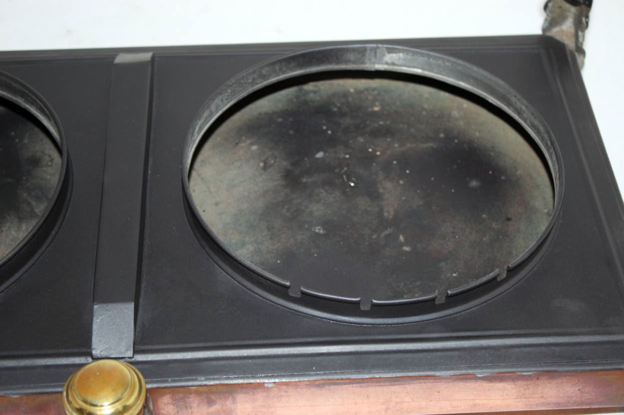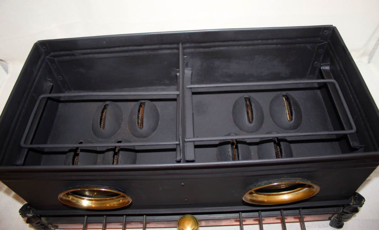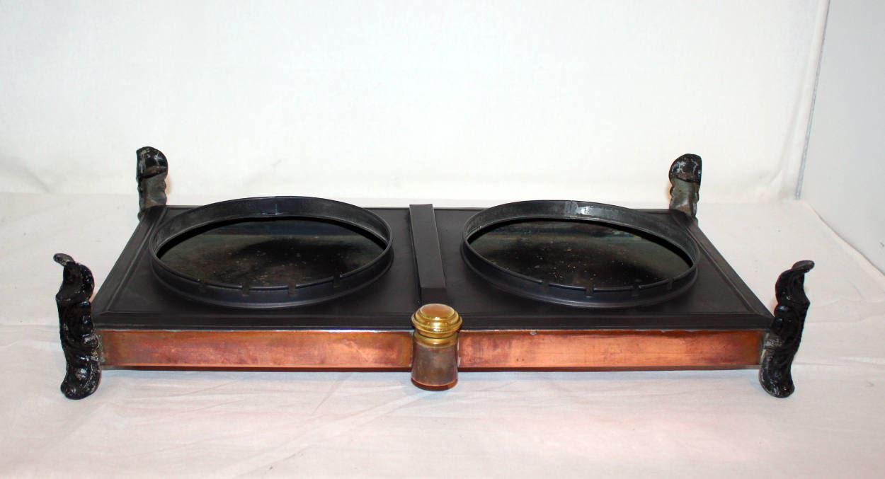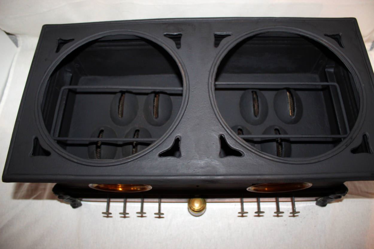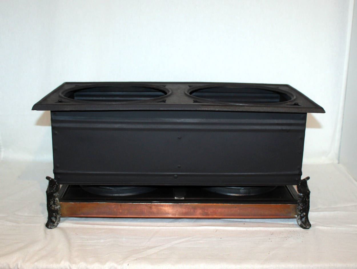 Bassin Kupfer mit Messing Einfüllstutzen, auf 4 Gusseisen Füssen stehend. Brennerkammer bestehend aus Blech mit zwei Sichtfenster mit Messingeinsätzen gerahmt. Abschluss bildet der Gusseiserne Pfannenabschluss. Bei nicht gebrauch verschliessen zwei Bleche die Pfannenaufnahme