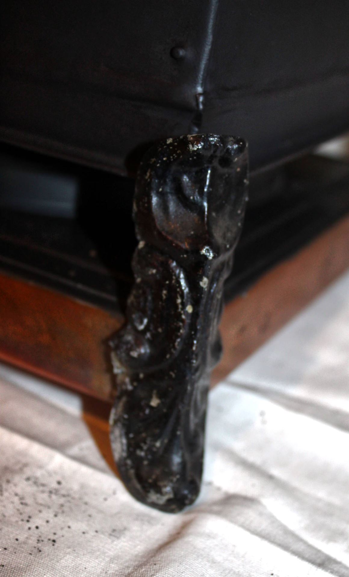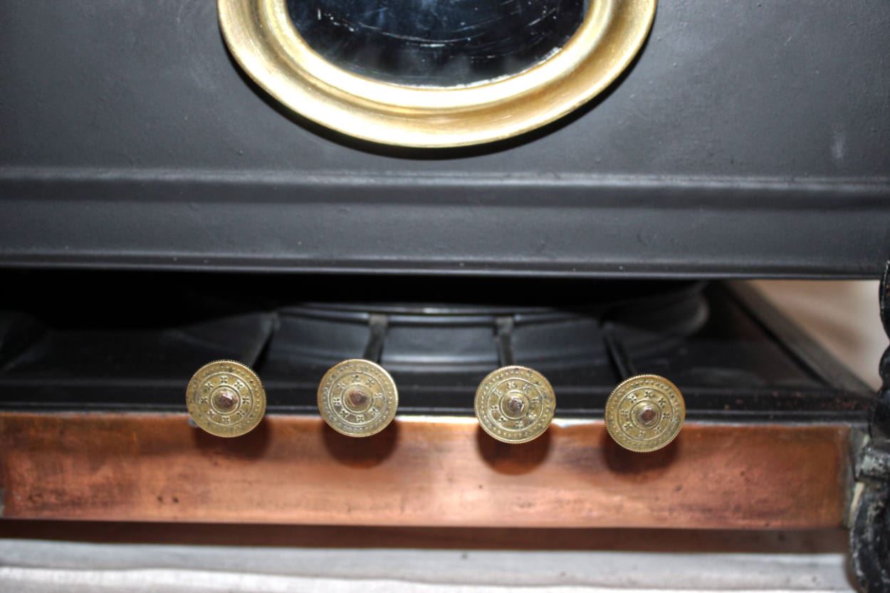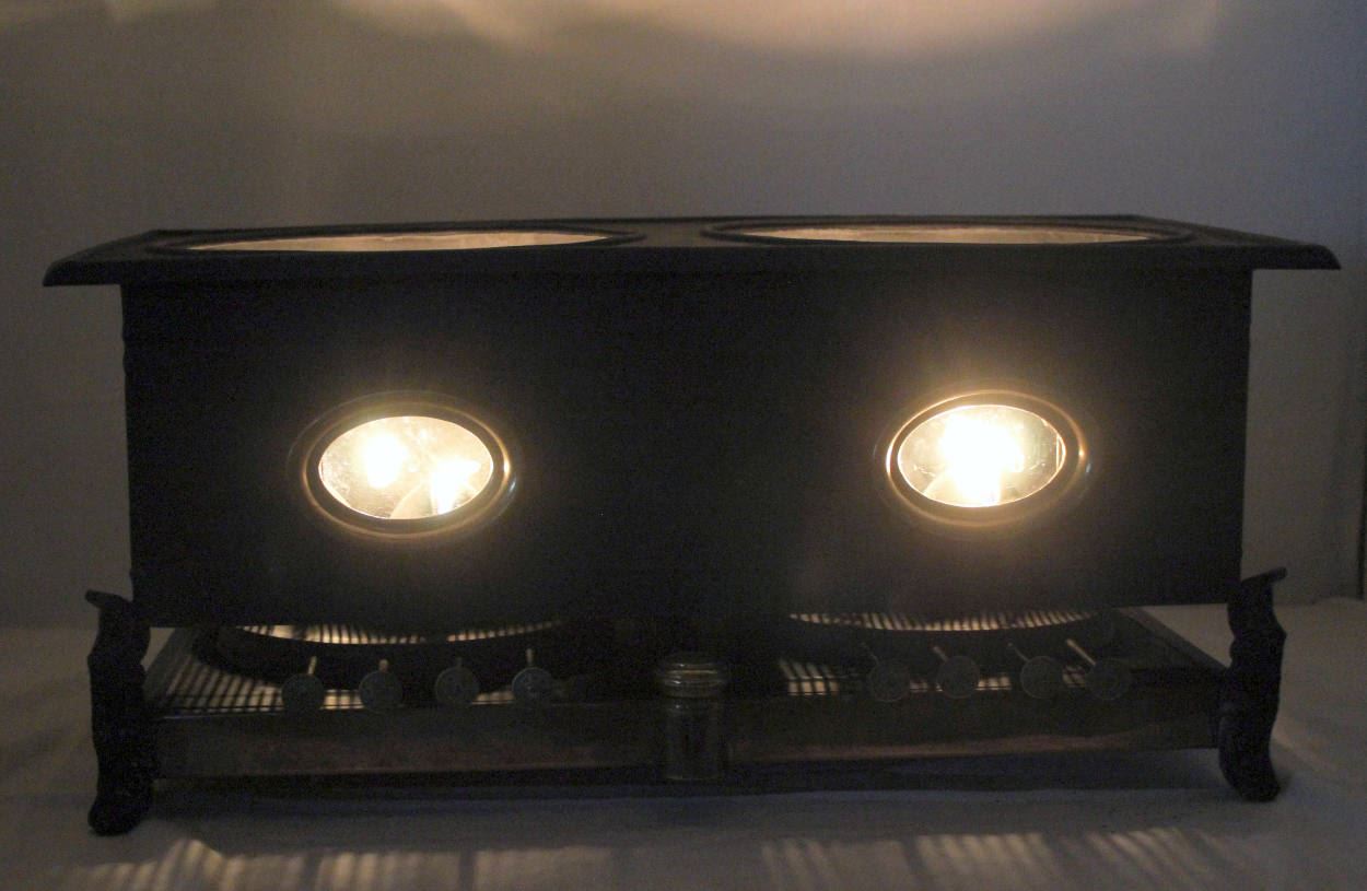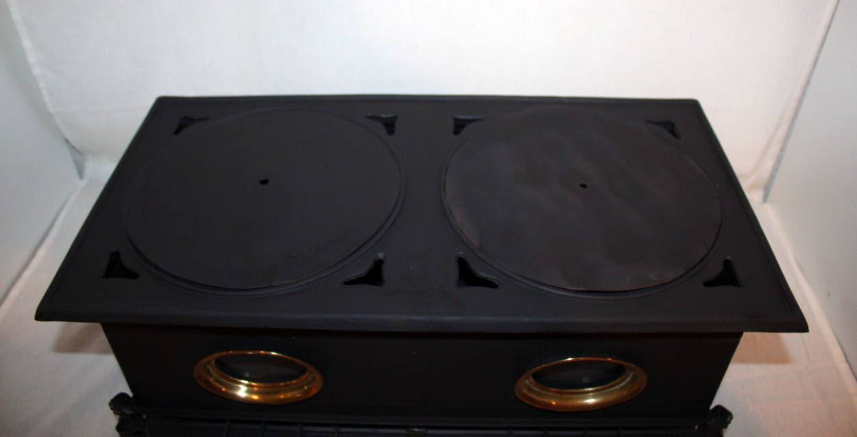 Bassin Kupfer mit Messing Einfüllstutzen, auf 4 Gusseisen Füssen stehend. Brennerkammer bestehend aus Blech mit zwei Sichtfenster mit Messingeinsätzen gerahmt. Abschluss bildet der Gusseiserne Pfannenabschluss. Bei nicht gebrauch verschliessen zwei Bleche die Pfannenaufnahme