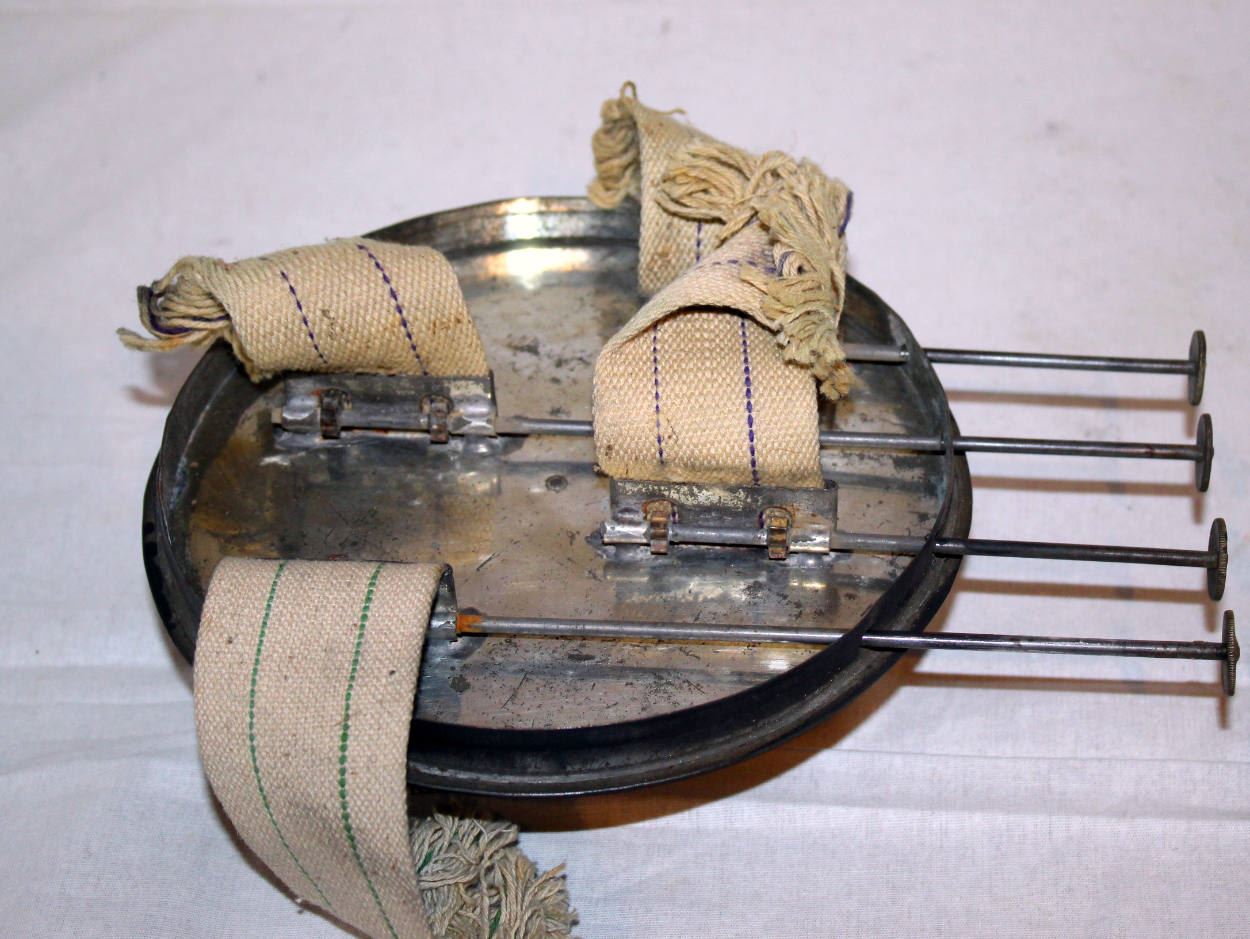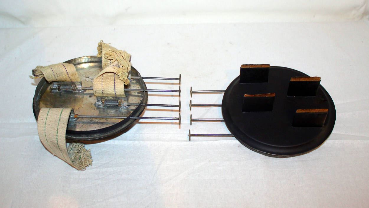 Ø Pfanne Aufnahme 2 x 270 mm. Im innern befinden sich zwei Drahtbügel um auch kleinere Pfannen aufzunehmen.