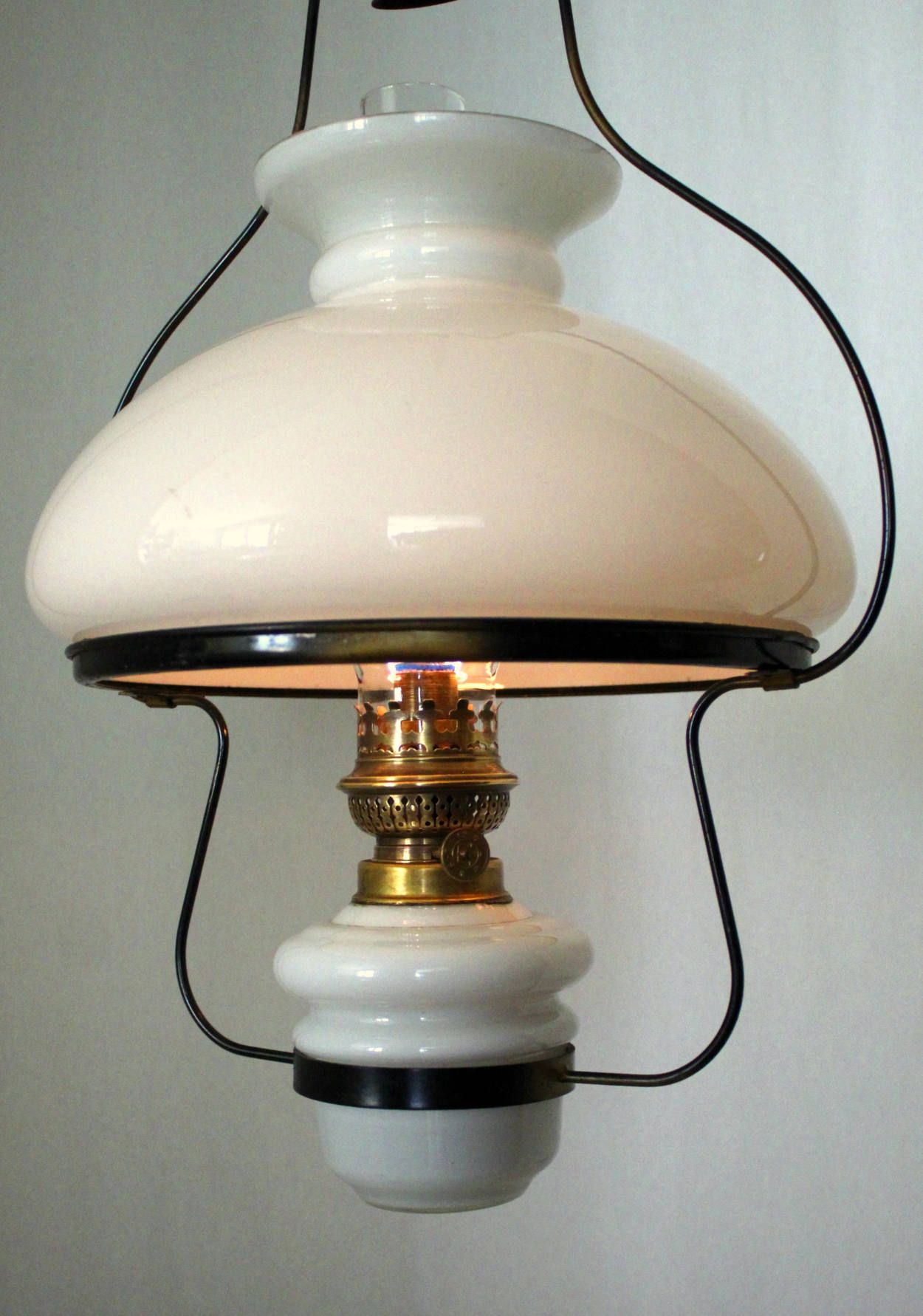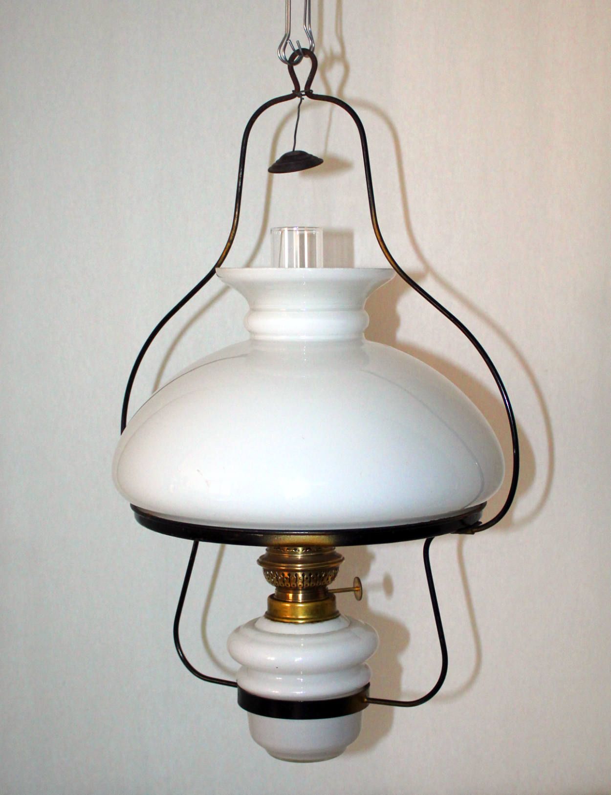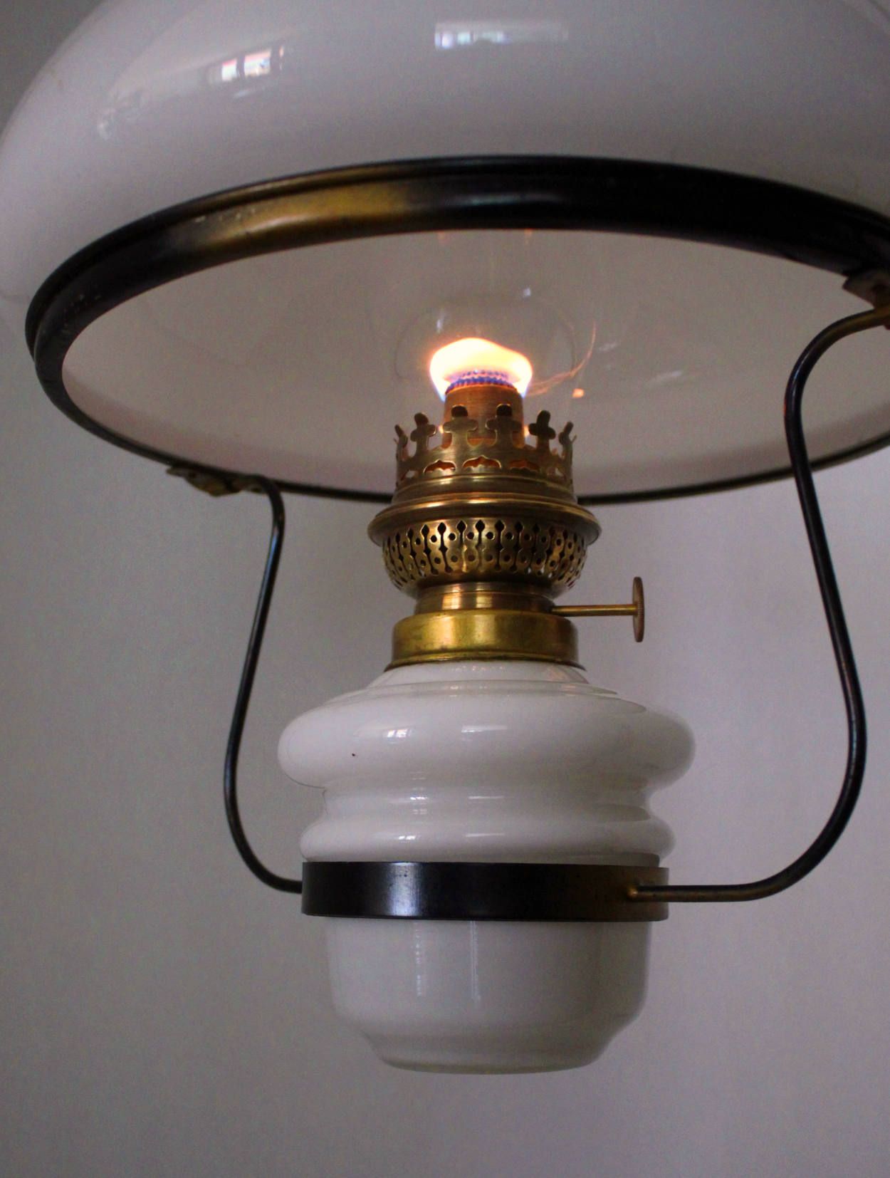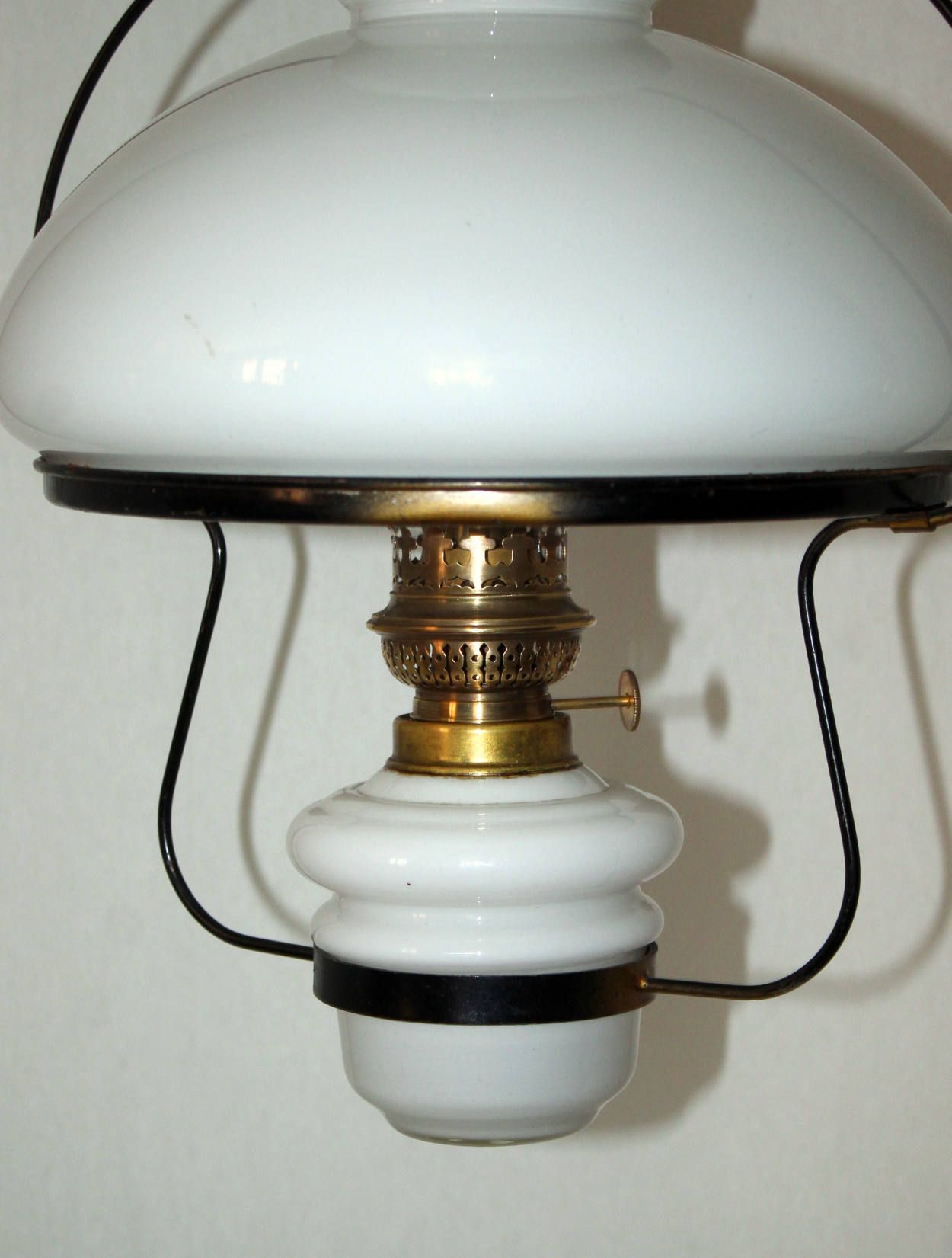 Eine schlichte Hängelampe in Lyra-Form. Elegante und dekorative Petrollampe der Jahrhundertwende mit Bassin und Schirm aus weißem Opalinglas. Die Lampe ist in einer charakteristischen Drahtaufhängung montiert, das Bassin in der Halterung eingesetzt. Ausgestattet mit Messingbrenner und Glaszylinder.