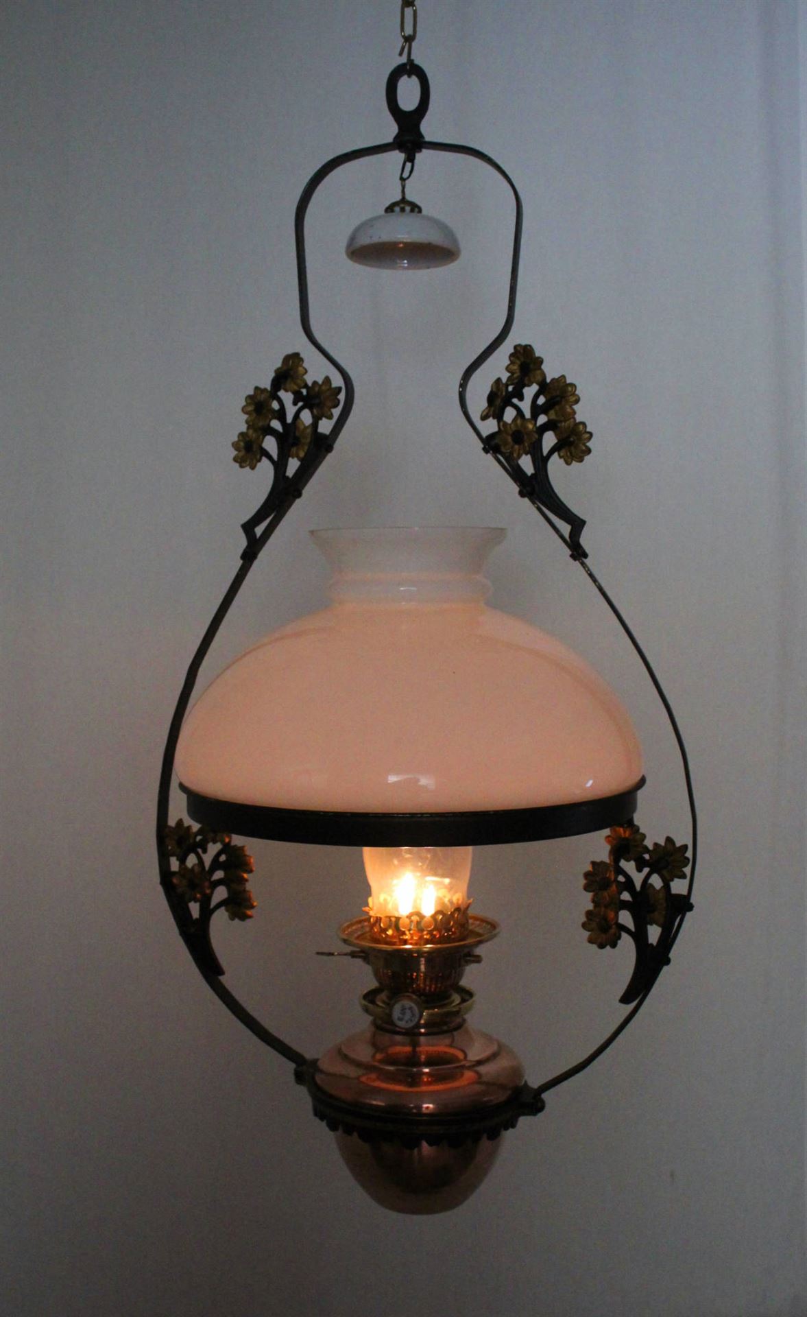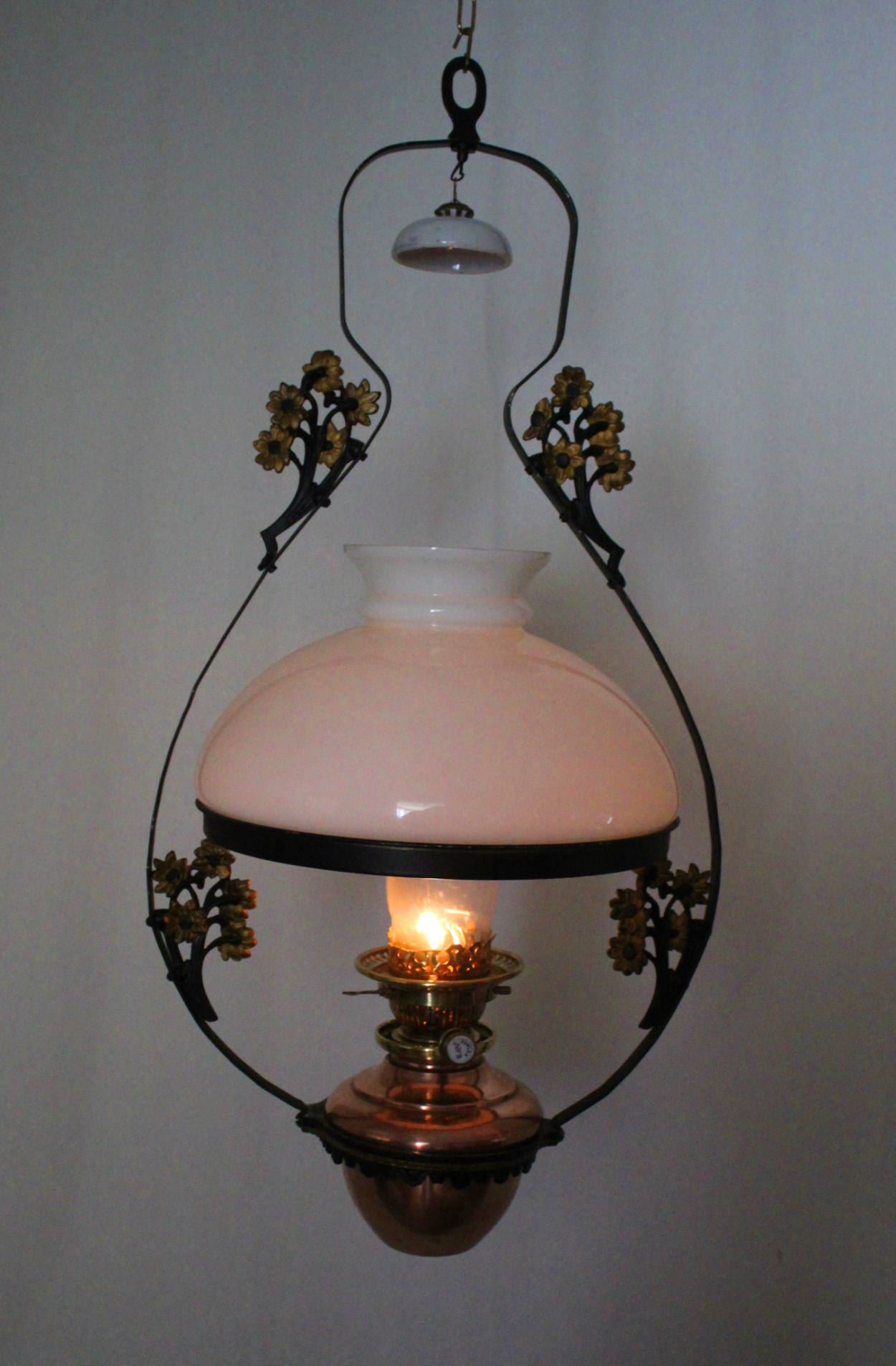 Eine schlichte Hängelampe in Lyra-Form evtl. vom britischen Hersteller Veritas mit schönen Verzierungen in Jugendstil; ungefähr von 1920. New Hinks Hängelampe ohne Nummerierung wohl zwischen 1919 und 1933.