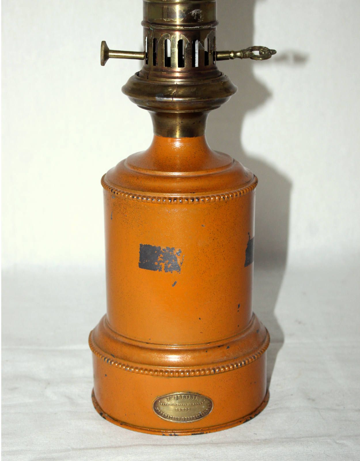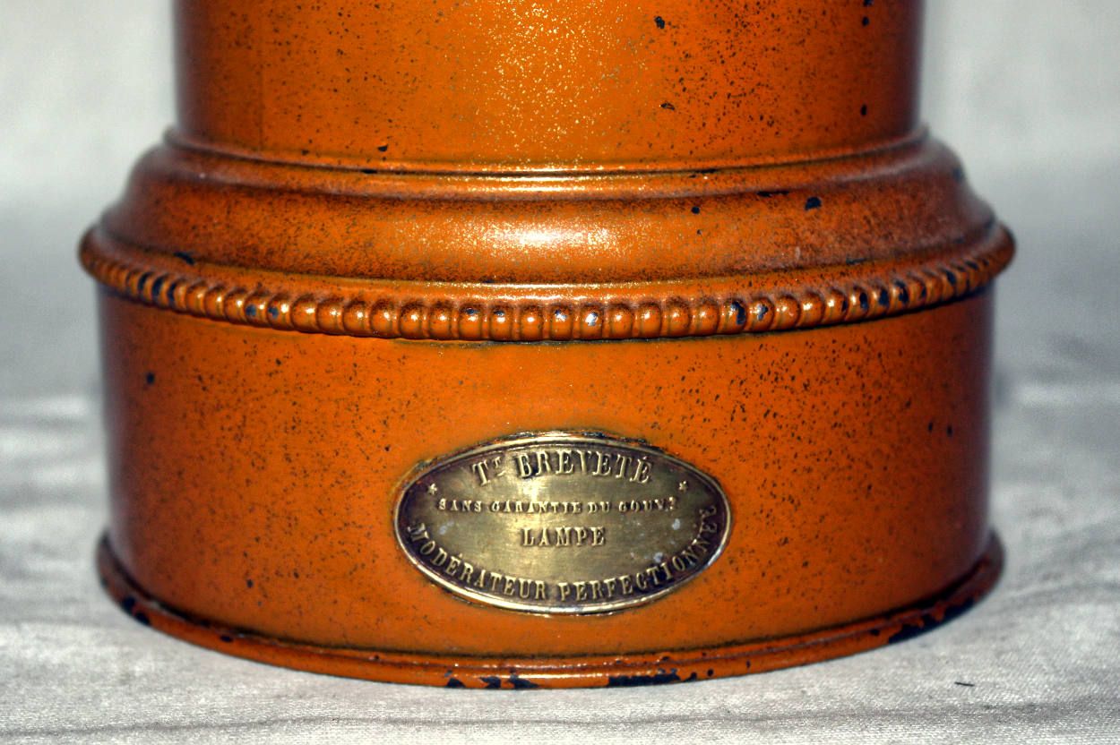 Modérateur-Öllampe aus Frankreich, Lampe ist mittels Messingschild beschriftet "Modérateur-Öllampe „TT Breveté – Lampe Modérateur Perfectionnée“, Frankreich.