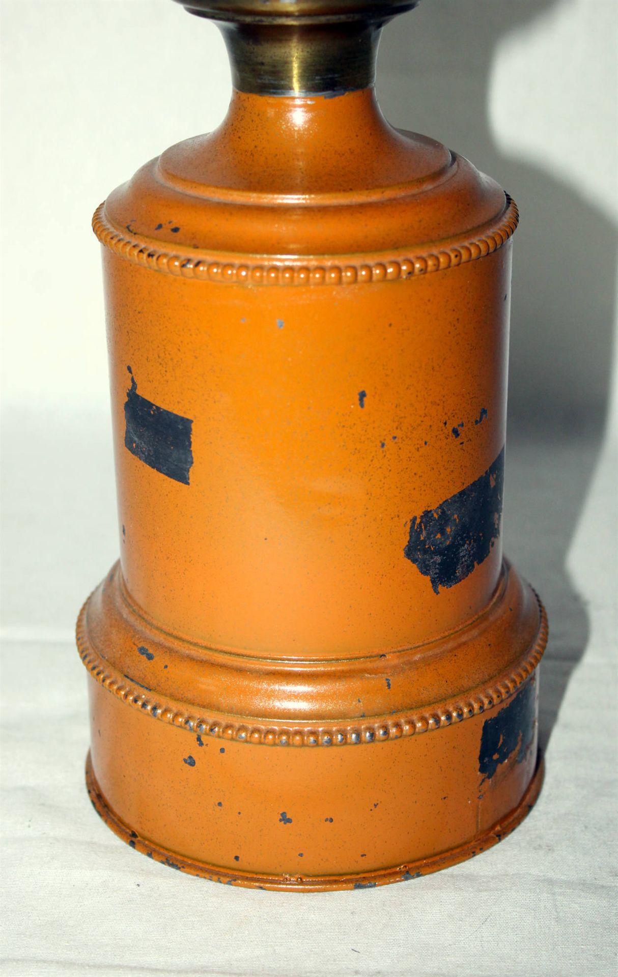 Schlichte Modérateur-Öllampe aus Frankreich mit braun lackiertem Blechkörper. Der zylindrische Lampenkörper ist einfach gehalten und oben sowie unten mit eingeprägten Zierlinien versehen. Die funktionale Gestaltung verweist auf eine eher industrielle Fertigung des späten 19. Jahrhunderts.