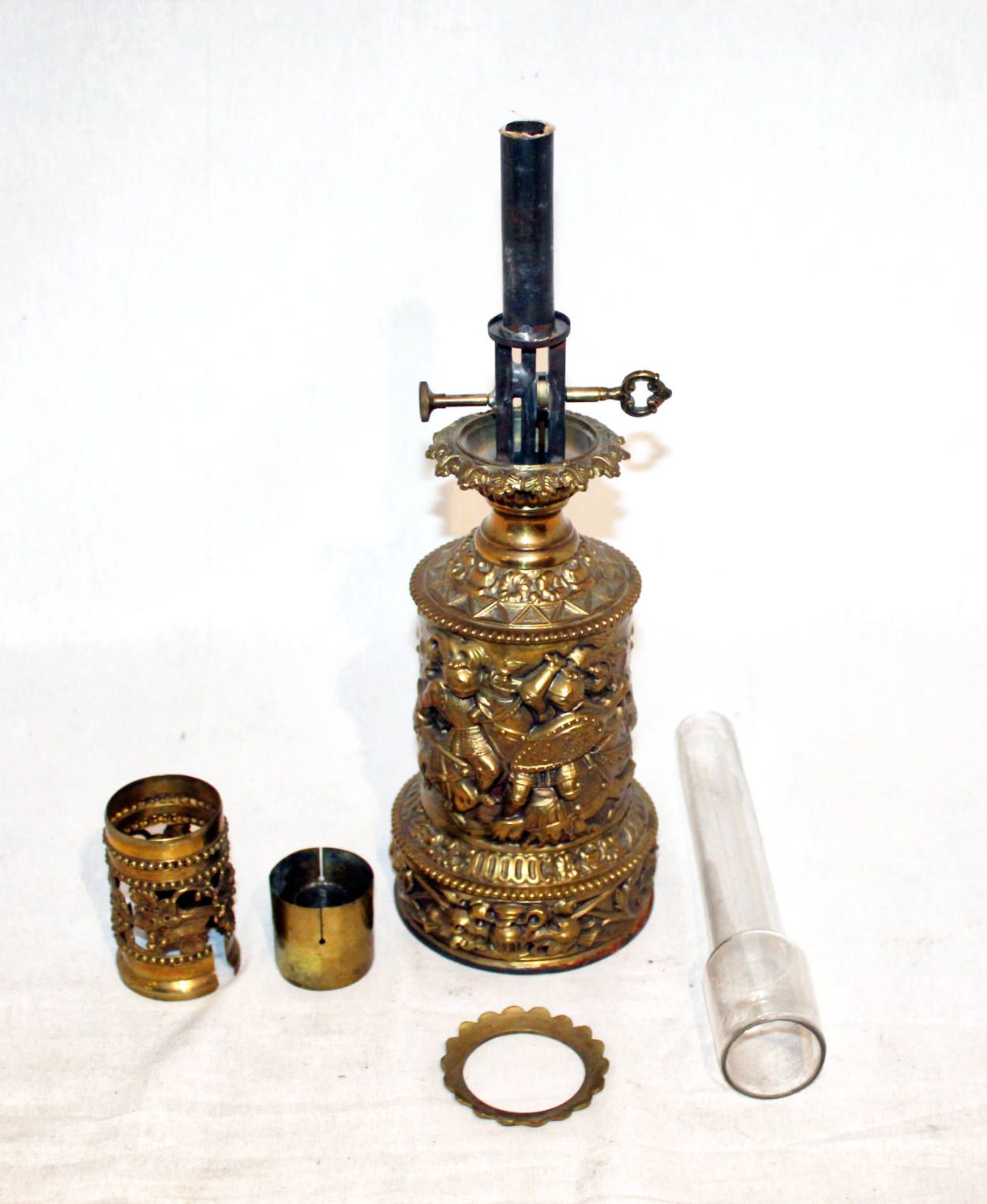 Modérateur-Öllampe aus Frankreich, Lampenkörper aus plastisch geprägtem Messingblech. Abbildung Ritter im Kampf. Sockel und Übergang ebenfalls aus plastisch geprägtem Messingblech.