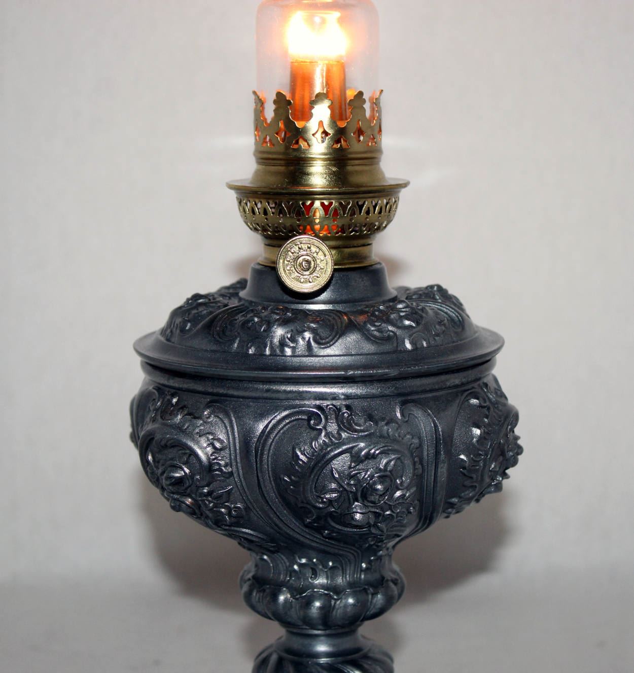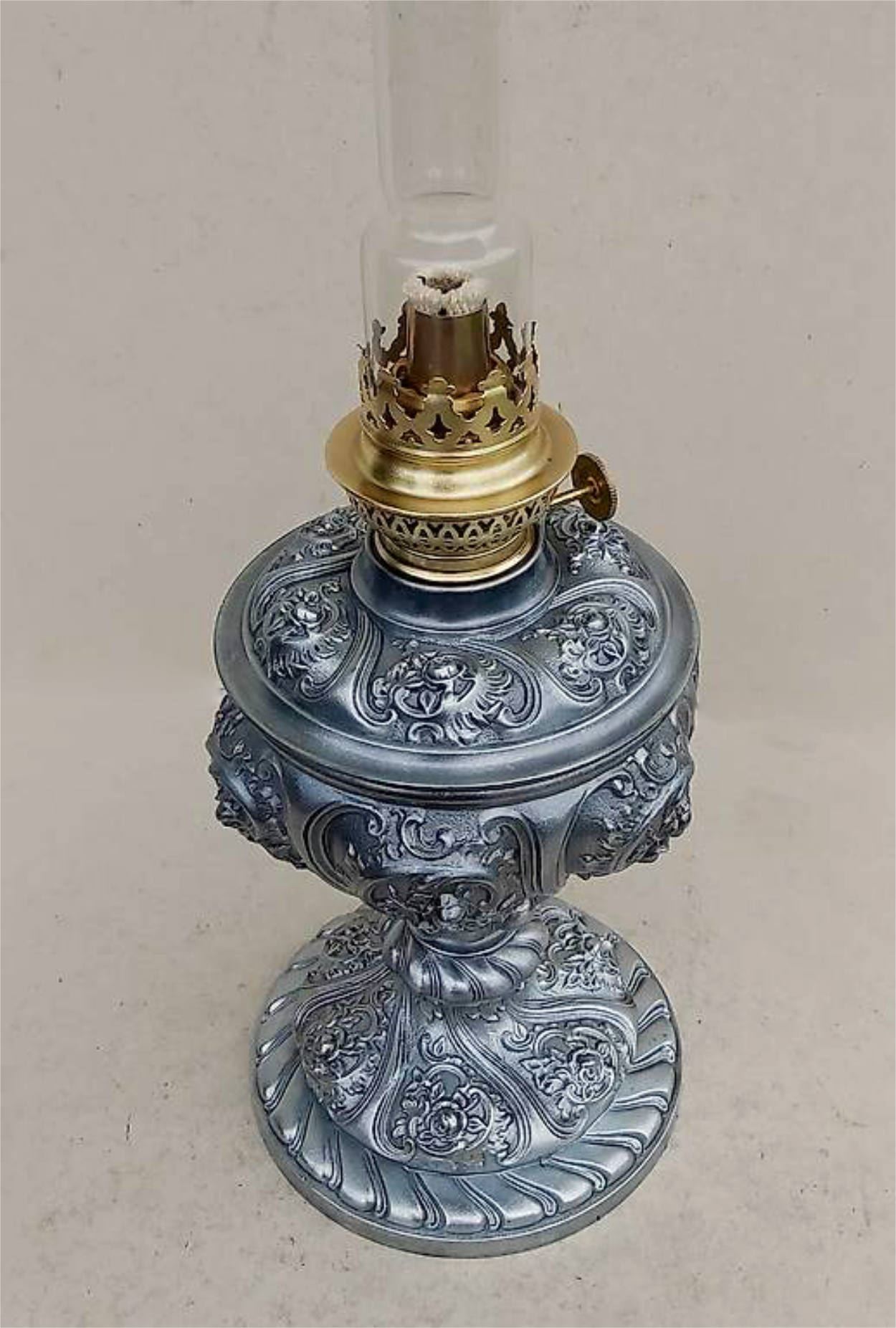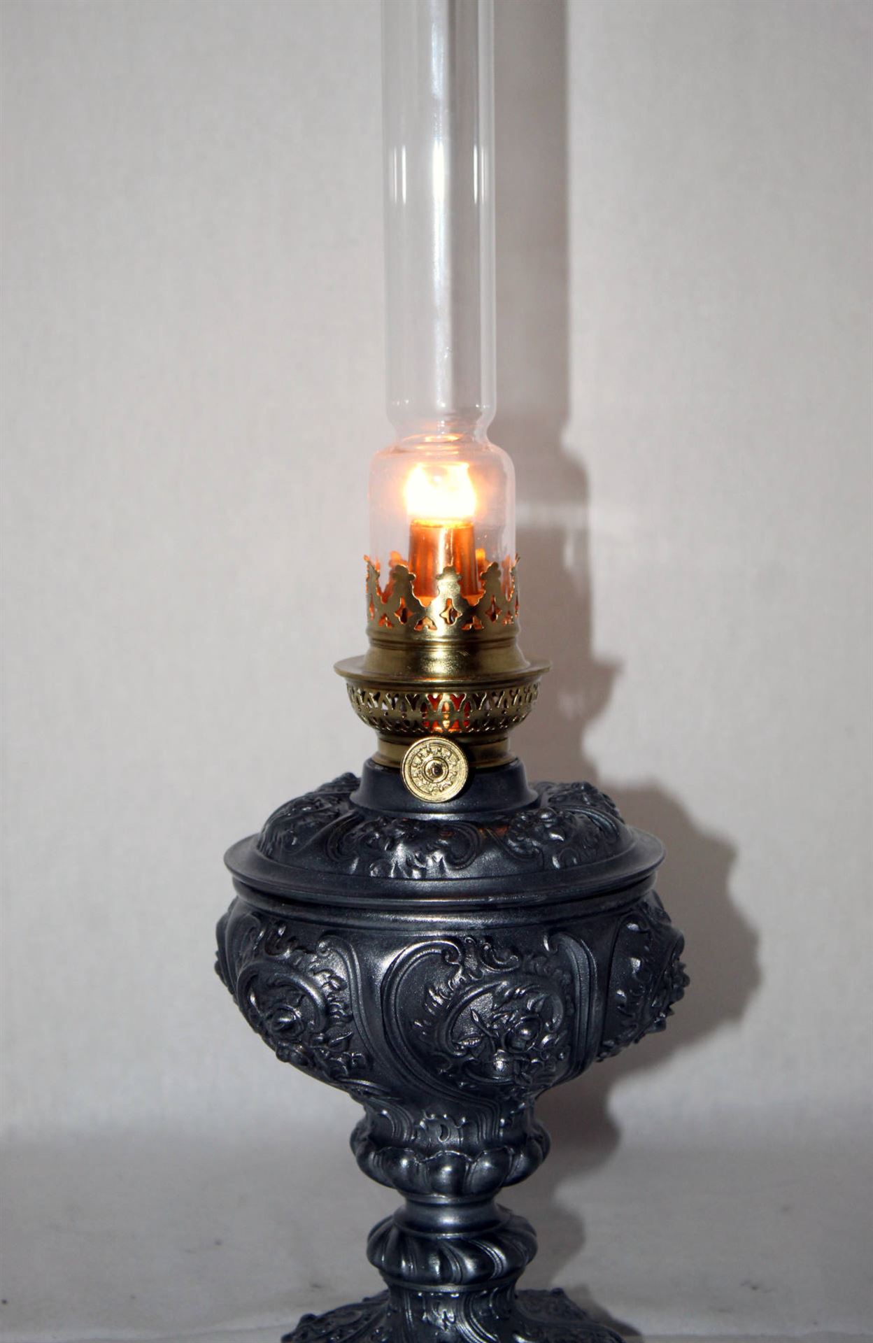 Sehr schöne, alte Zinkguss Petrollampe mit tollem Rosendesign ca.1900-20
