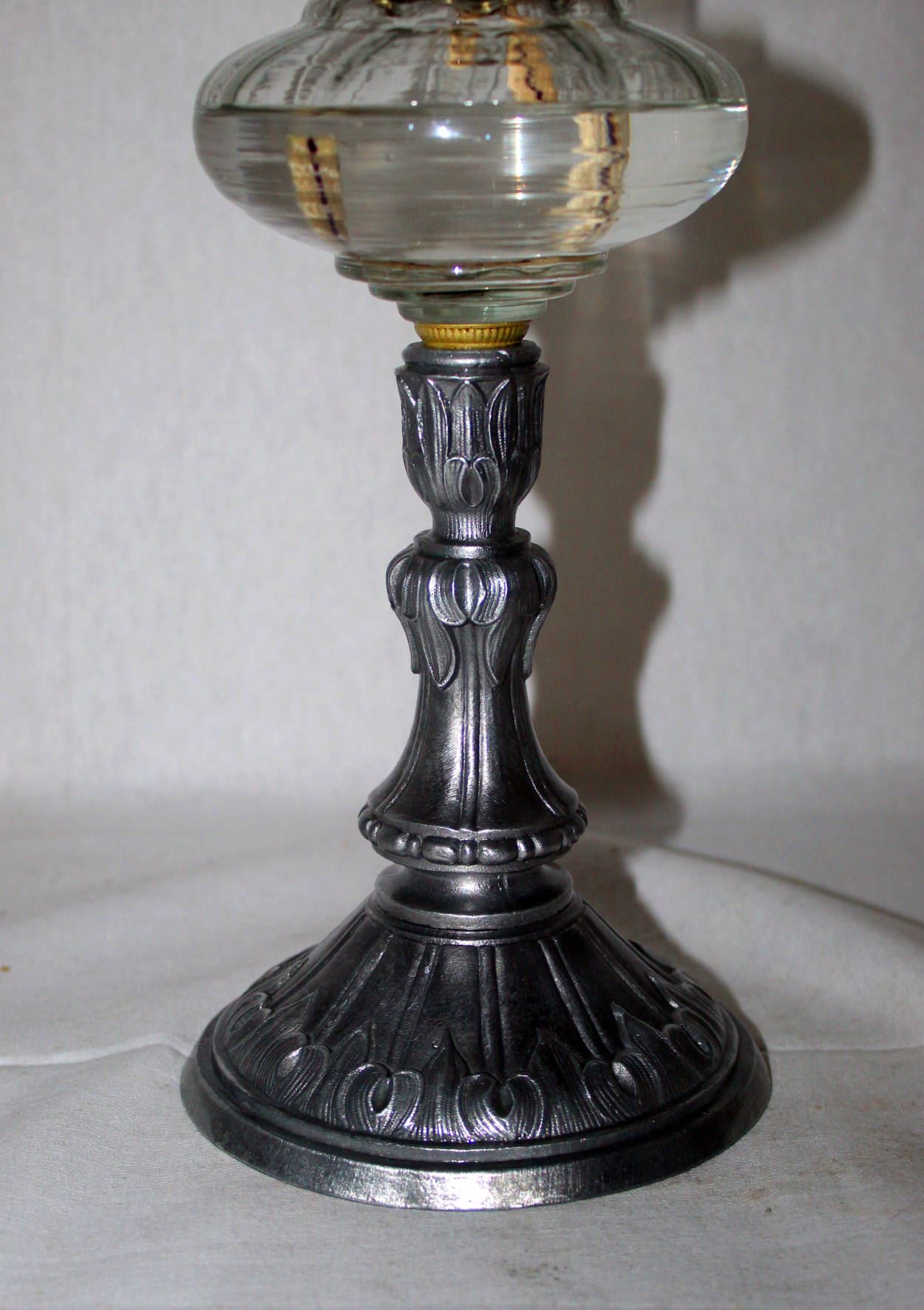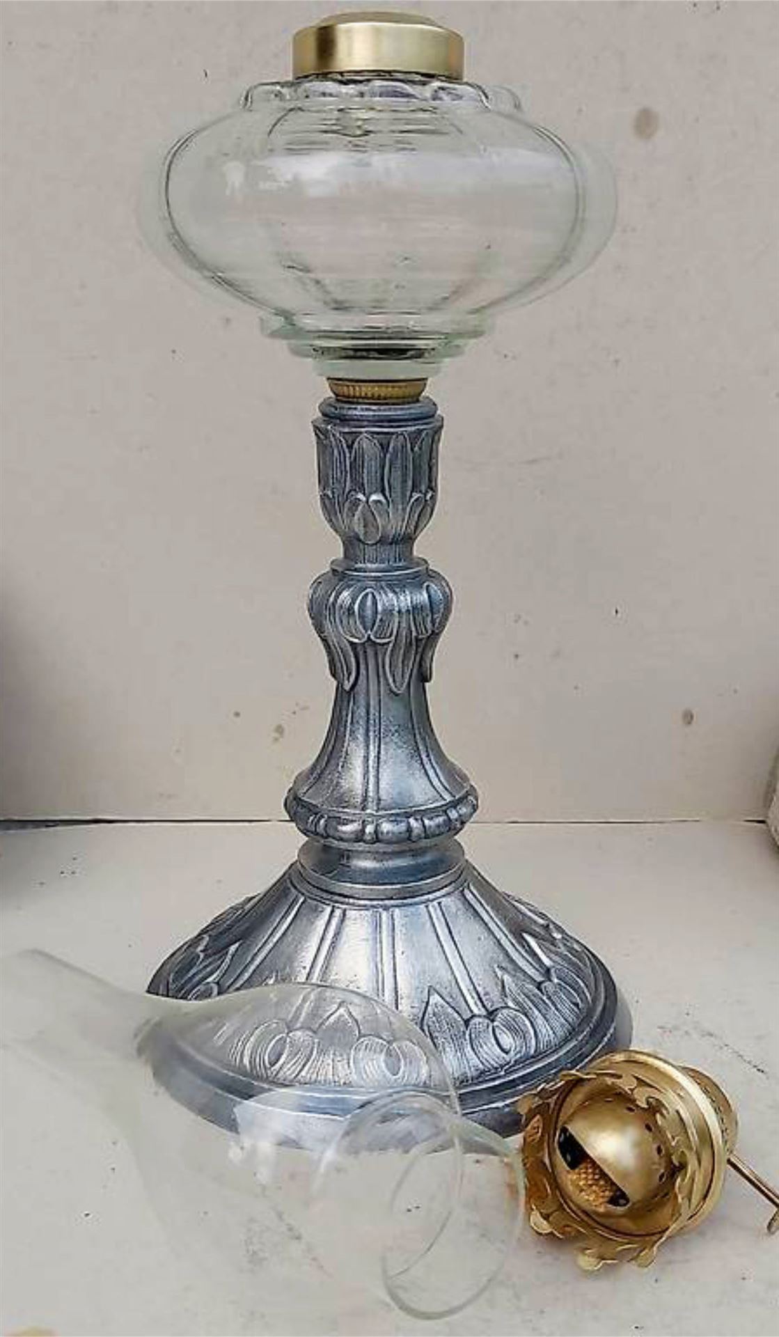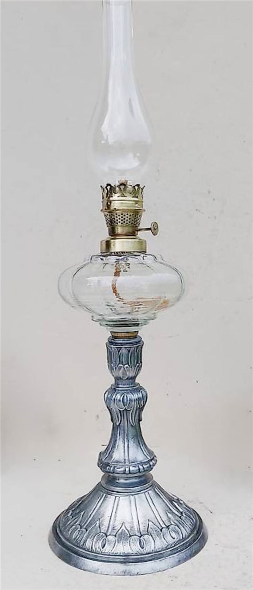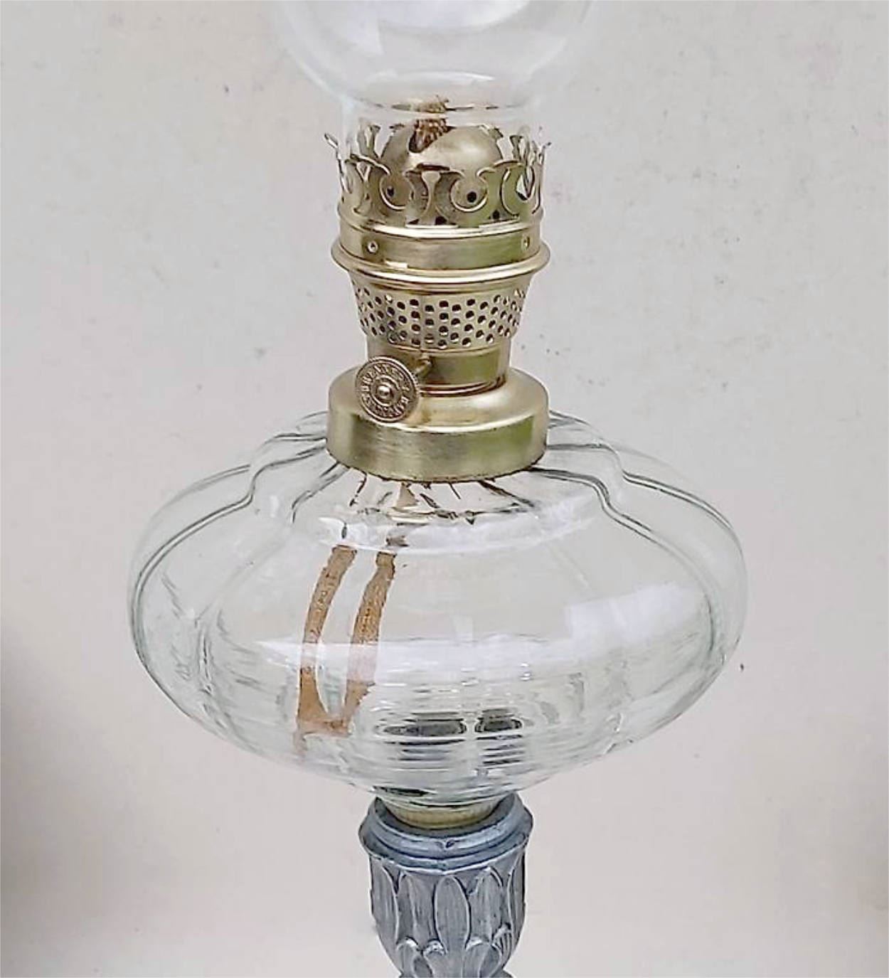 schöne kleine Petrollampe mit tollem Ständer und verziertem Glasbehälter. Wohl Österreich um 1895-1900