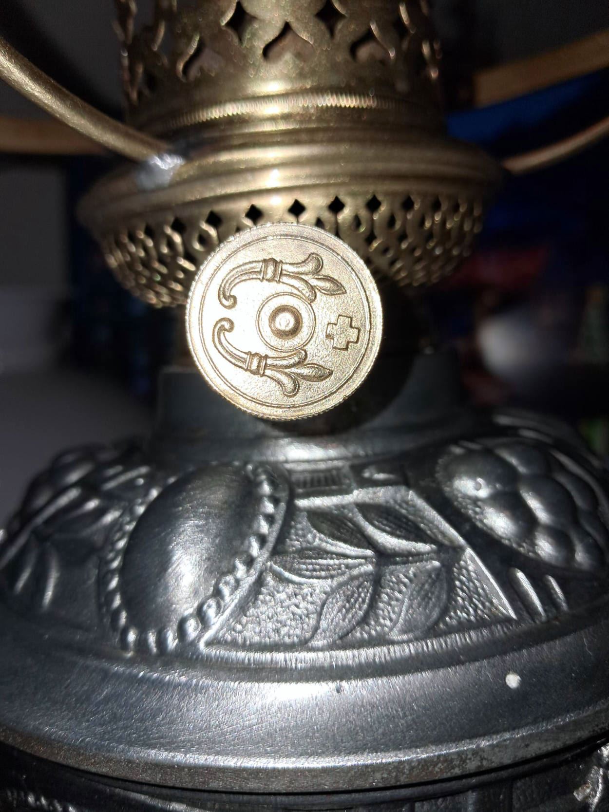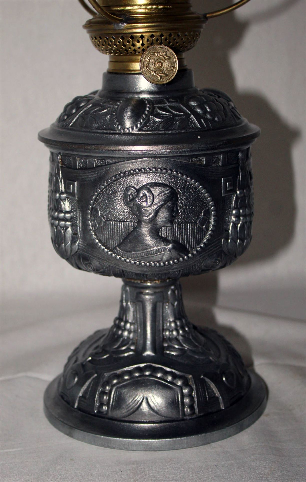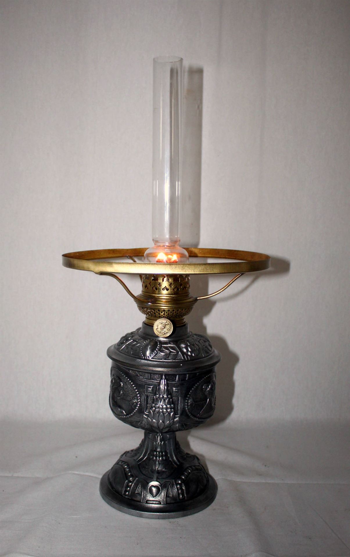 Petroleumlampe um 1920 mit Superschöne mit eindrücklichen Jugendstilverzierungen.