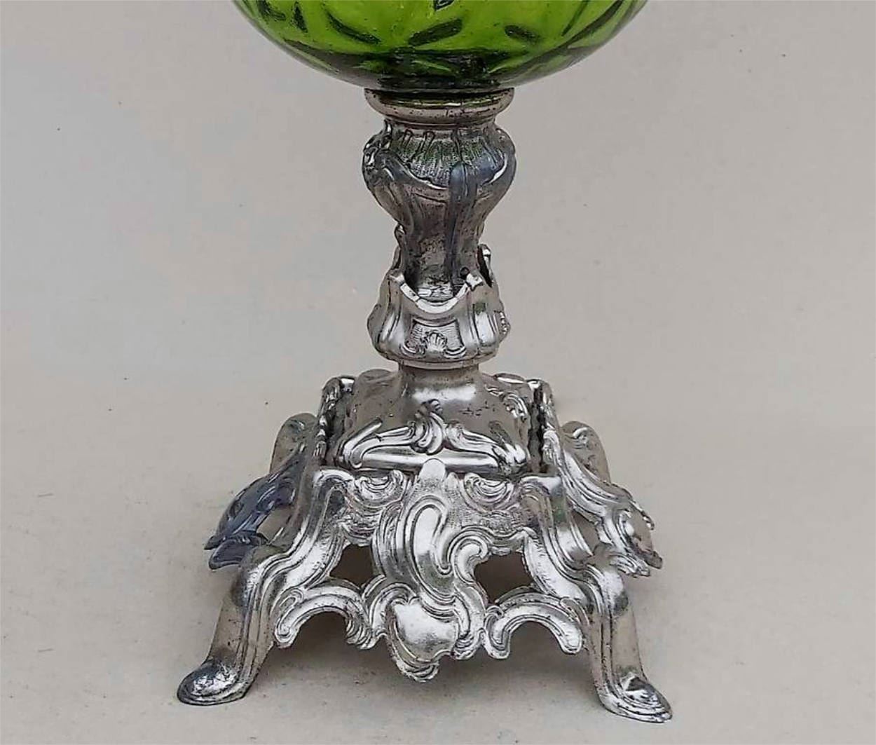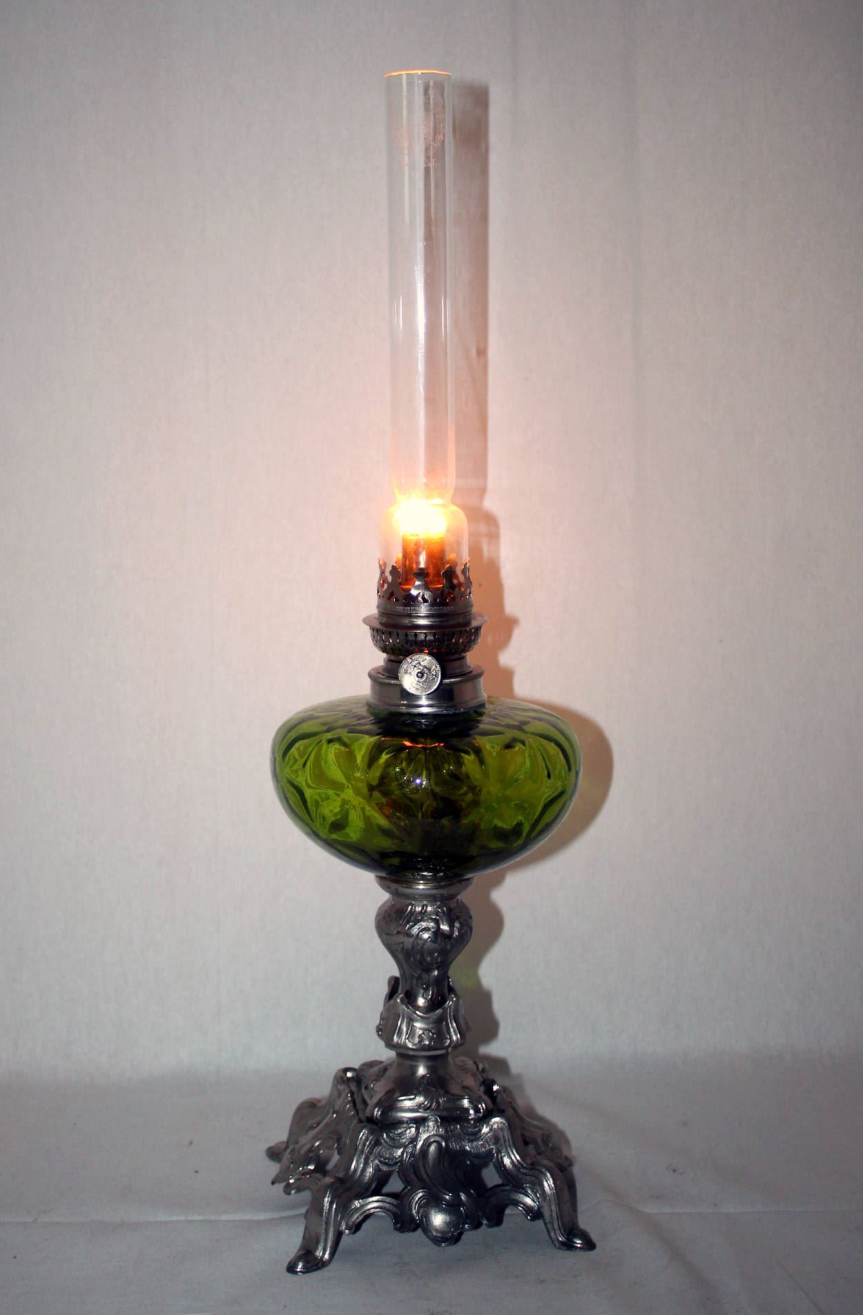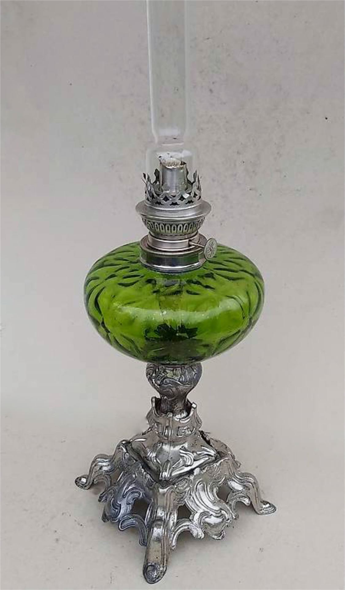 Grosse Grüne Petroleumlampe mit barockem Ständer um 1900. Sehr schöne, grüne Petrollampe mit tollem, vernickeltem, barockem Fuss