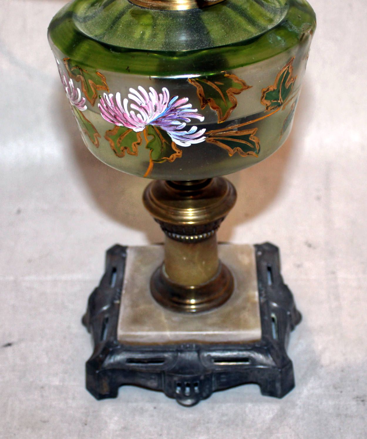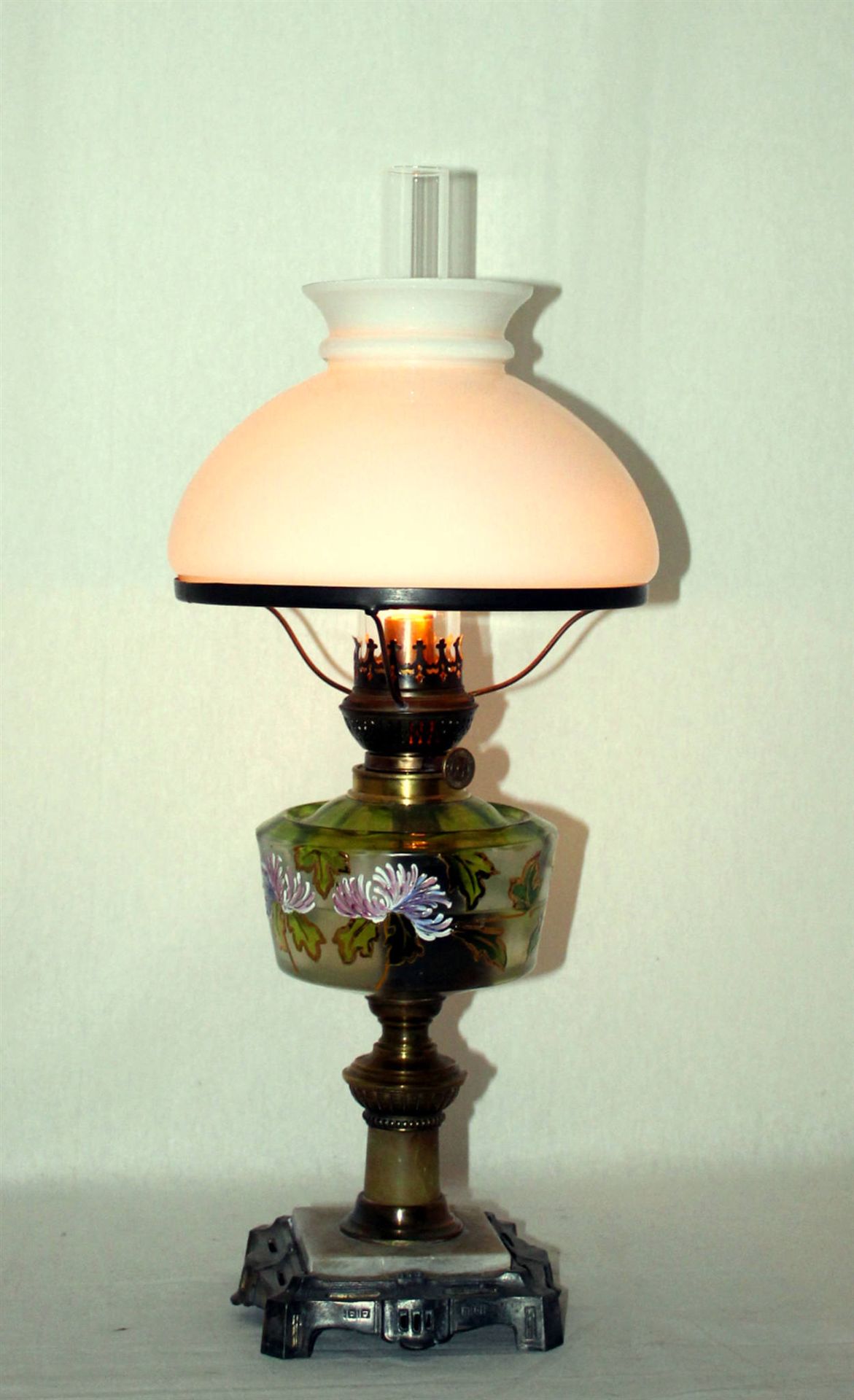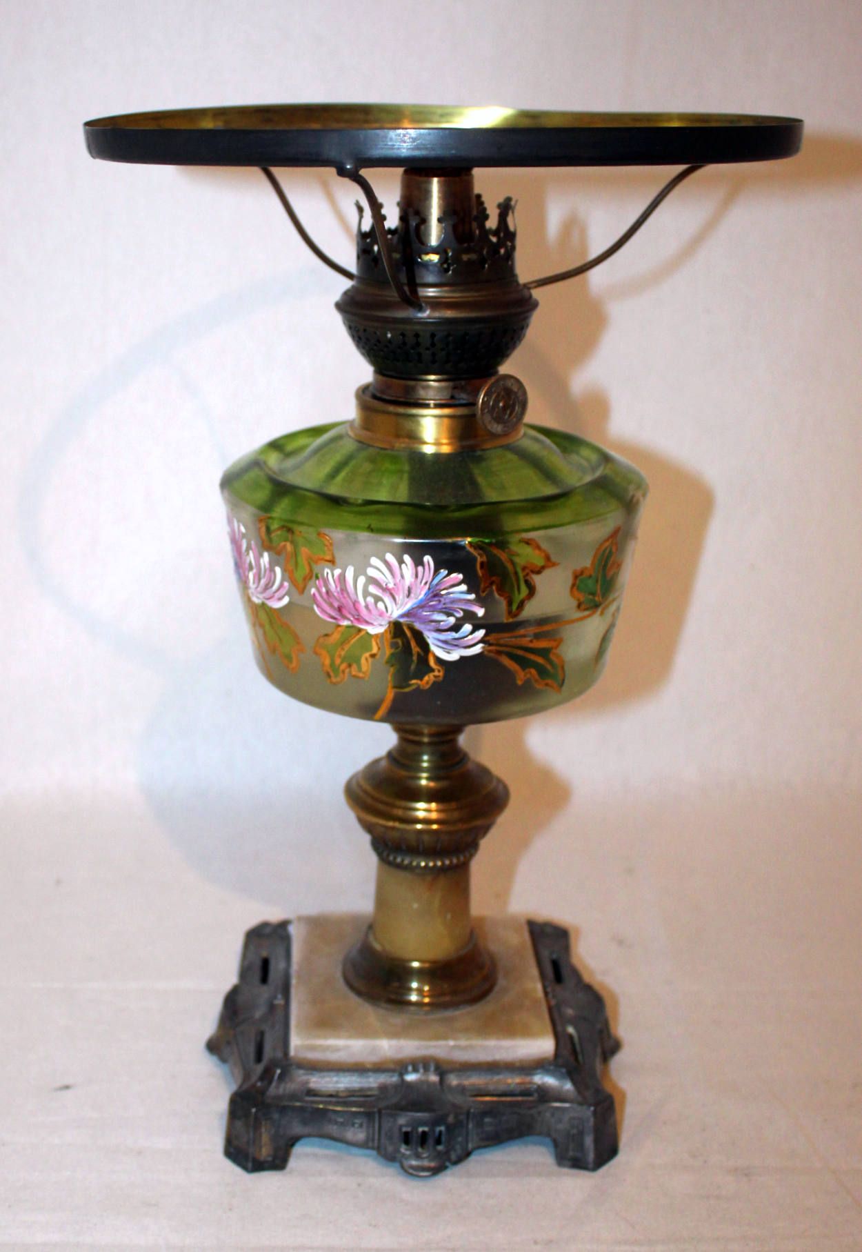 Eine recht simple Lampe mit einem schönen, grünen / farblos satiniertem Glasbassin, das die Blicke auf sich zieht. Das Bassin ist mit Emaillemalerei verziert. Ich vermute, dass die Lampe eher aus den ersten Jahrzehnten des 20. Jahrhunderts, so um 1910-1920, stammt; wahrscheinlich aus Deutschland.