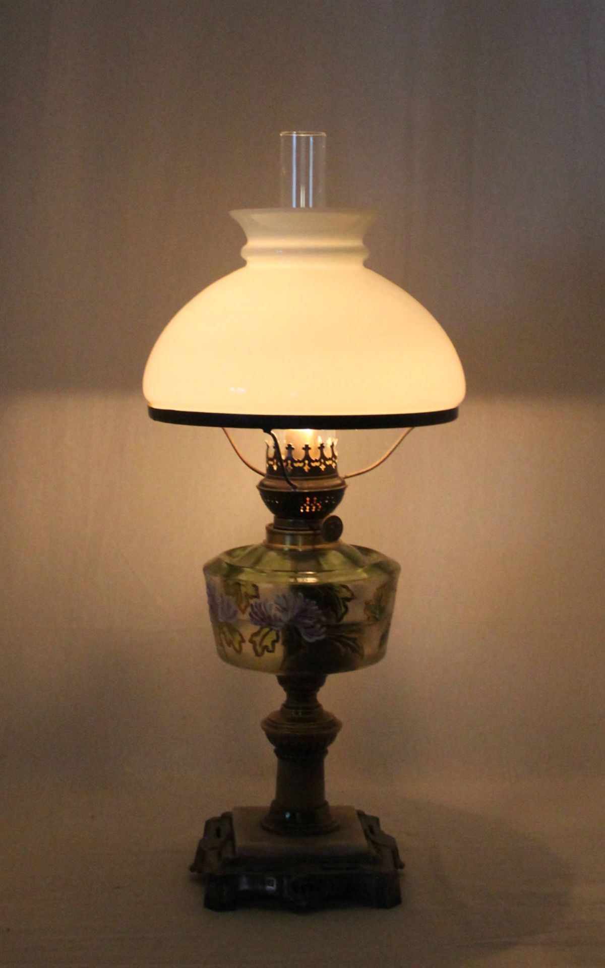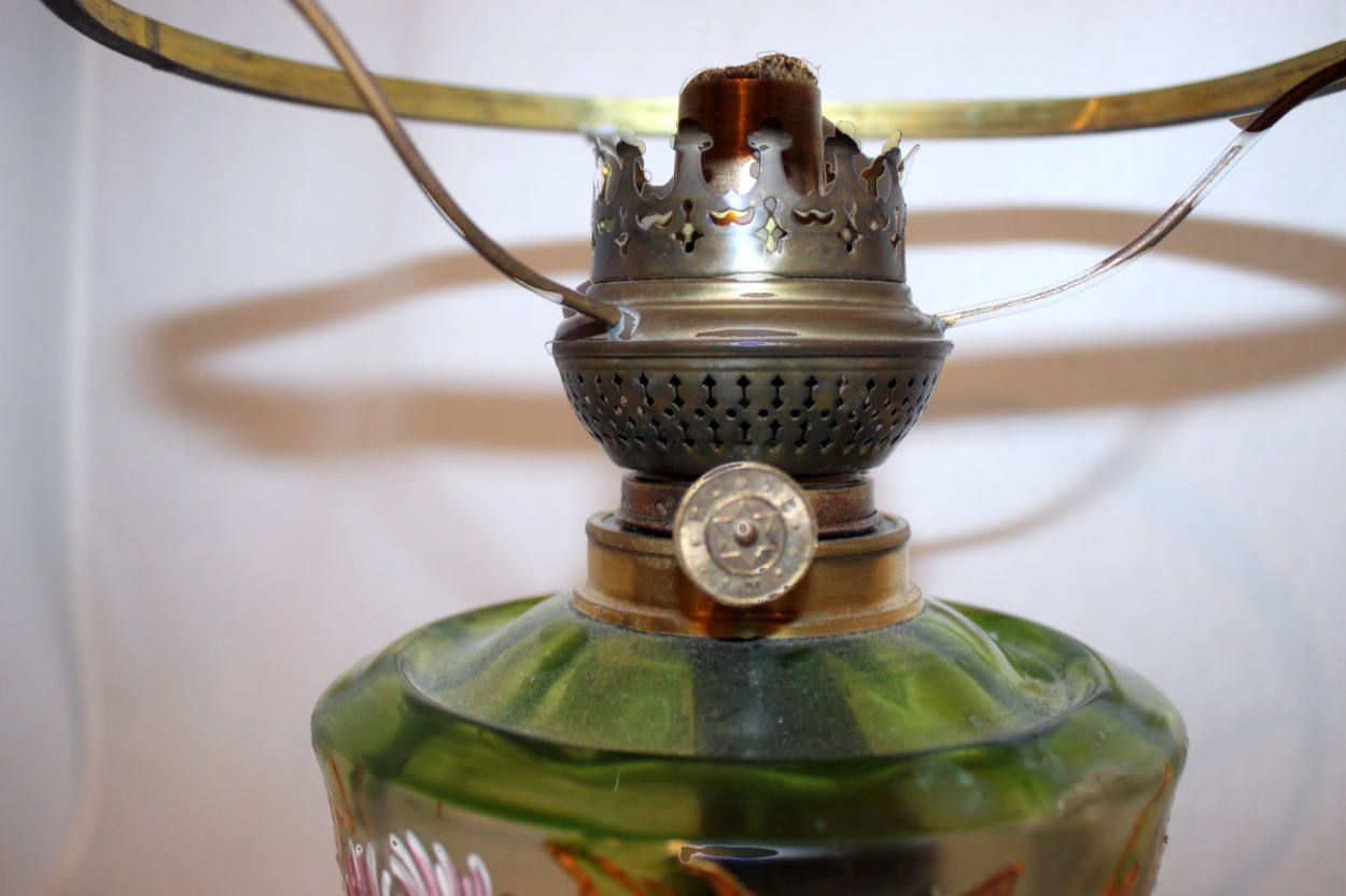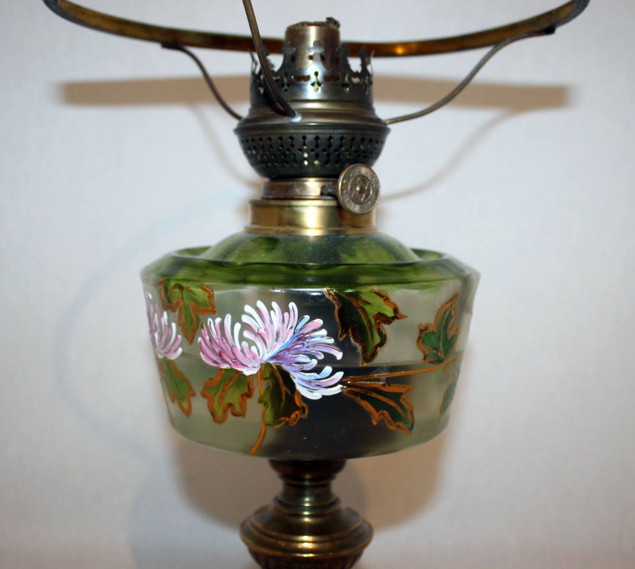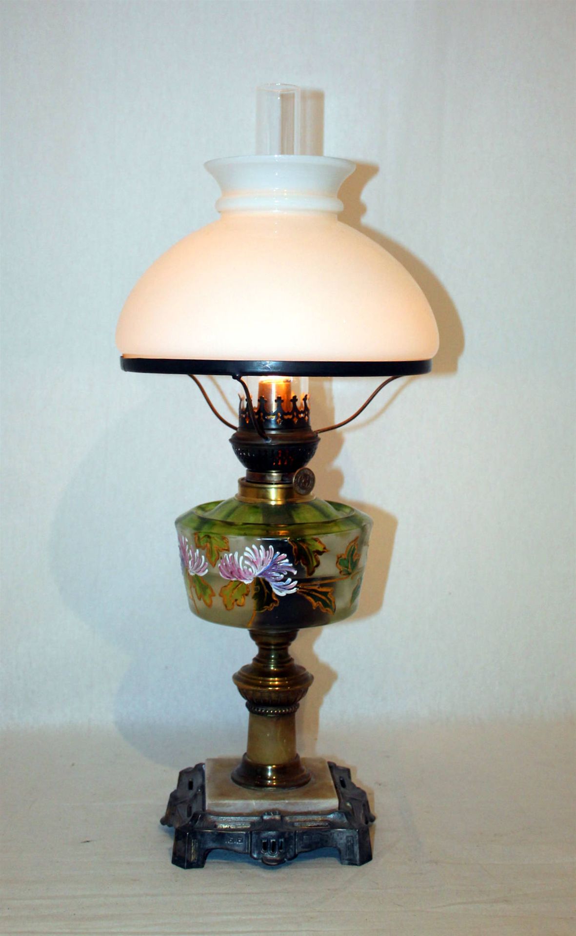 Eine recht simple Lampe mit einem schönen, grünen / farblos satiniertem Glasbassin, das die Blicke auf sich zieht. Das Bassin ist mit Emaillemalerei verziert. Ich vermute, dass die Lampe eher aus den ersten Jahrzehnten des 20. Jahrhunderts, so um 1910-1920, stammt; wahrscheinlich aus Deutschland.