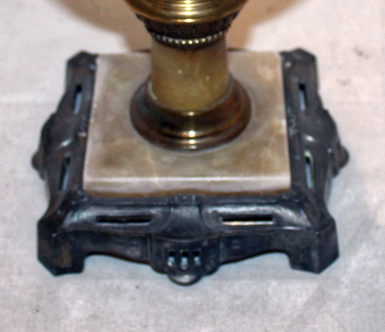 Der mehrfach durchbrochene Metallfuß ist aus Eisenguss geht über auf einen Marmorsockel welcher wiederum in einer Messingaufnahme und dann in einer kurzen Marmorsäule endet. Diese endet wiederum i einer Messingaufnahme welche den übergang zum Glasbassin bildet.