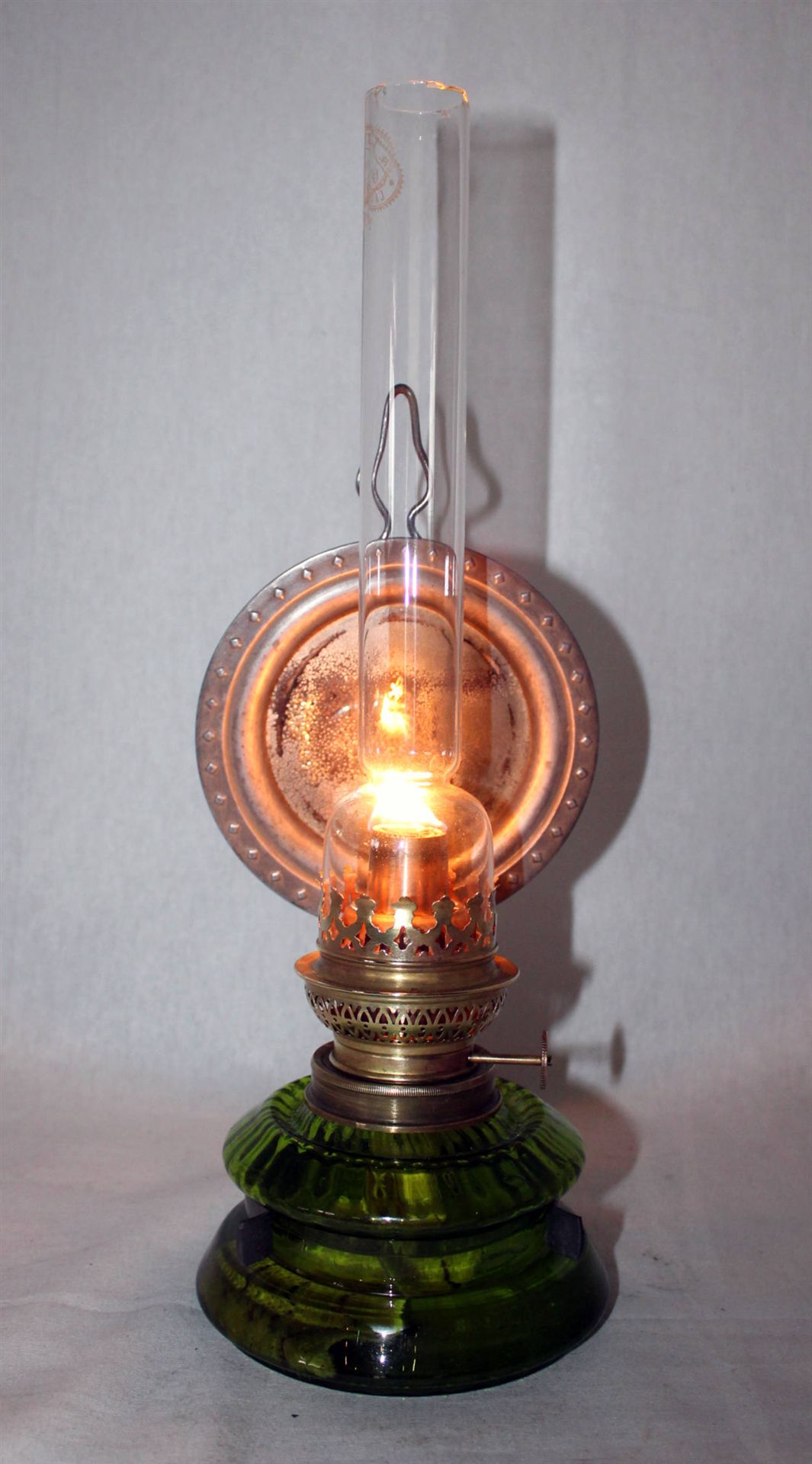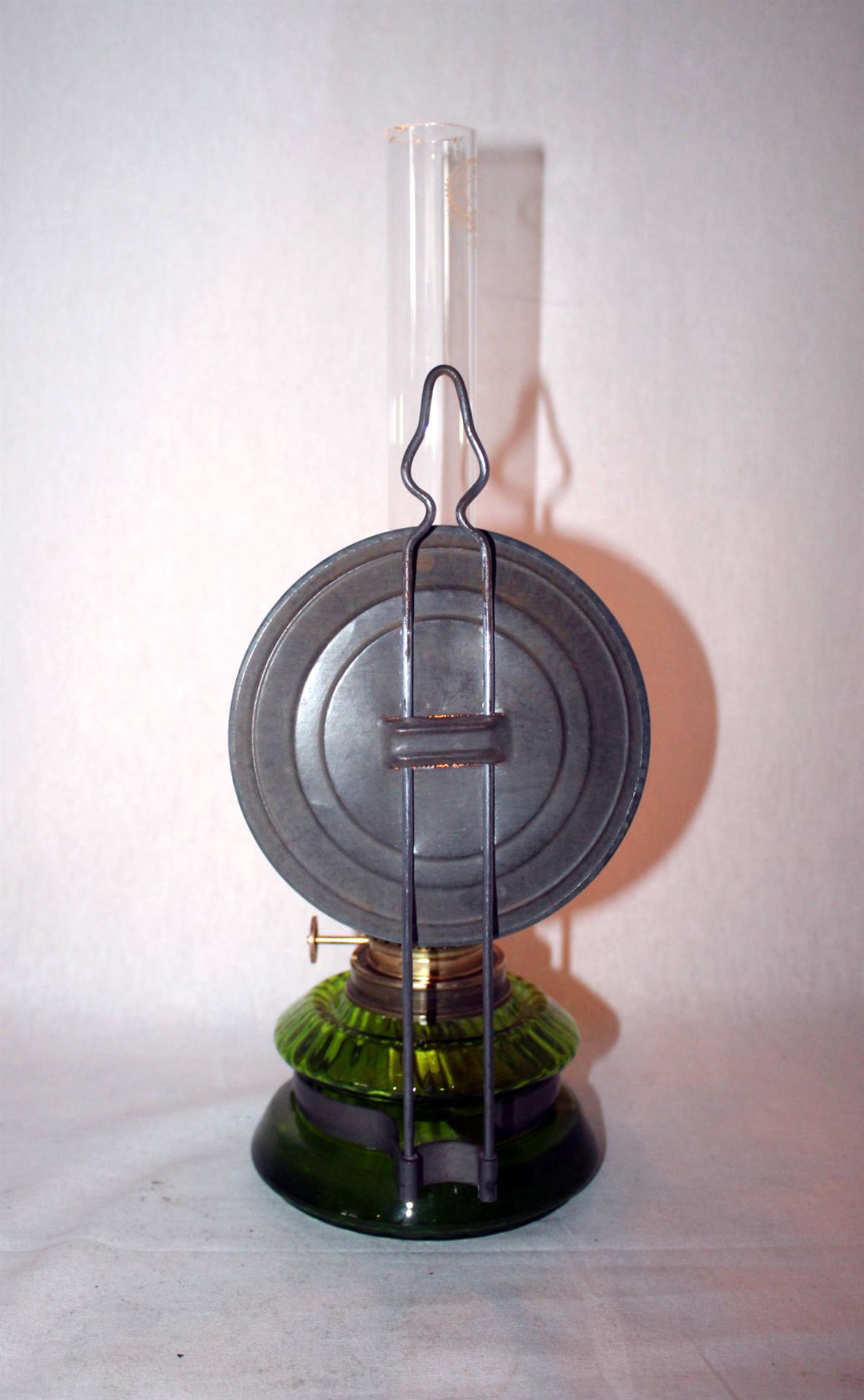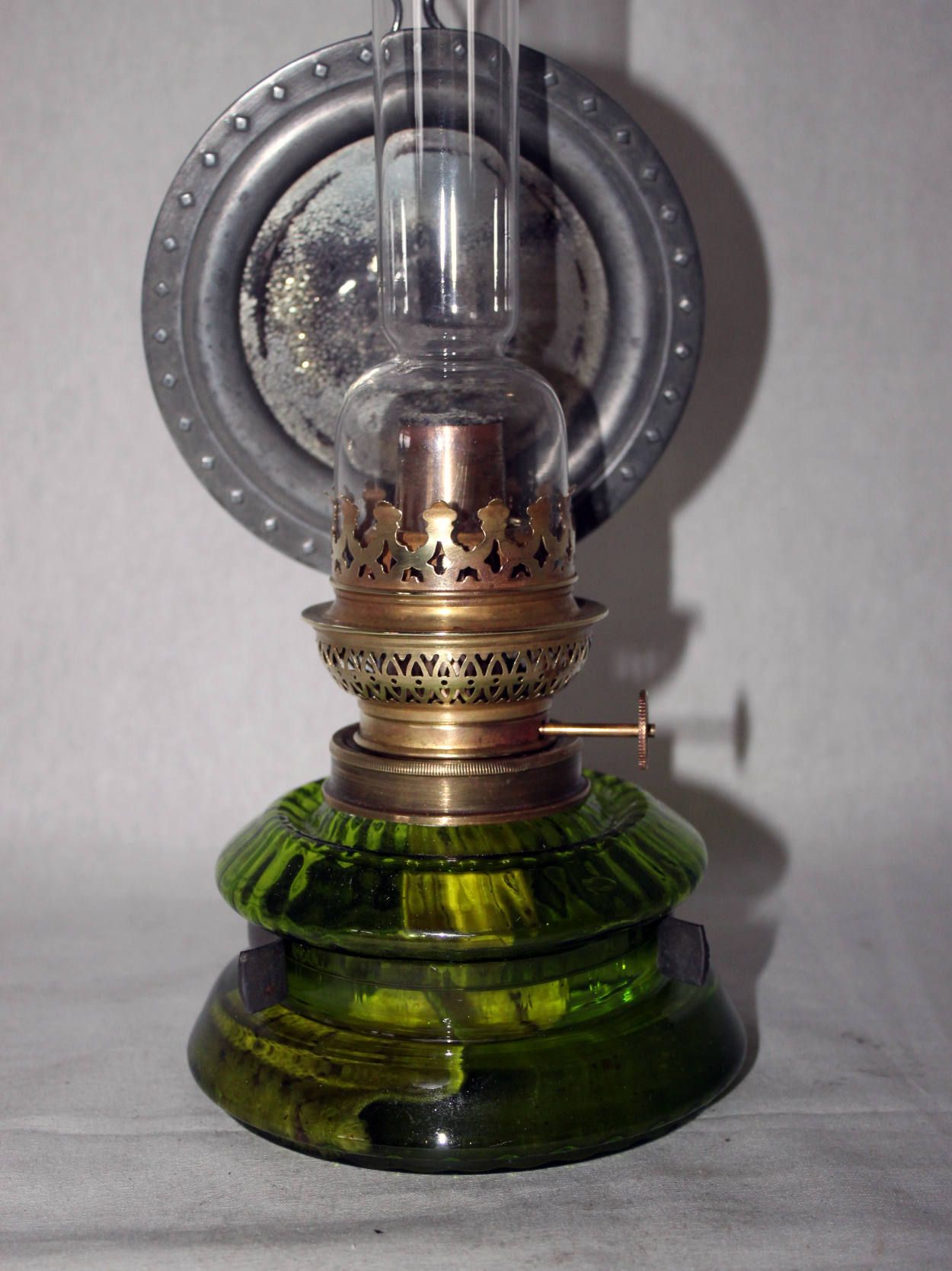 Antike Wand- bzw. Küchen-Petrollampe aus der Zeit um 1900, mit Weißblechreflektor in klassischer, funktionaler Ausführung verm. Deutschland