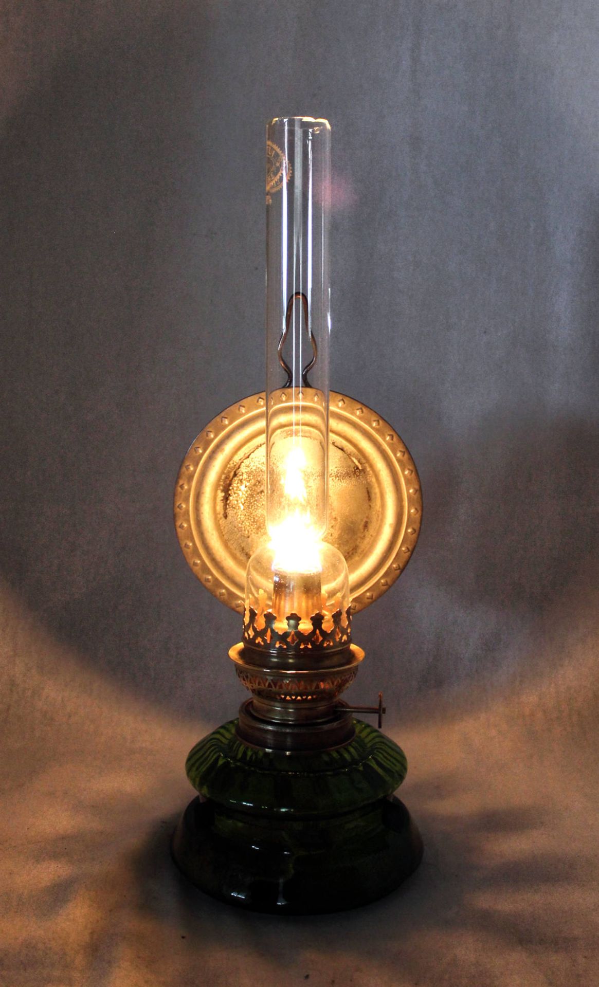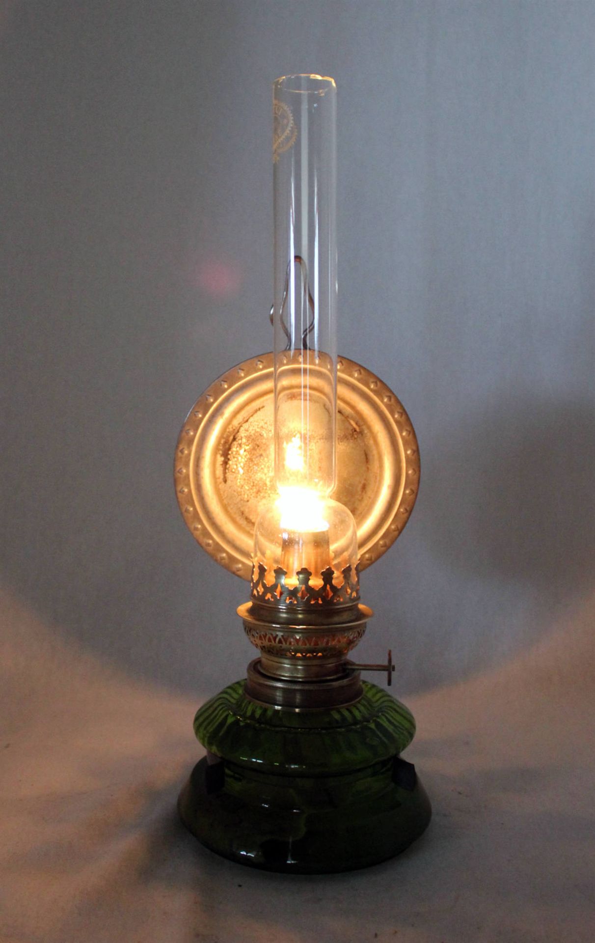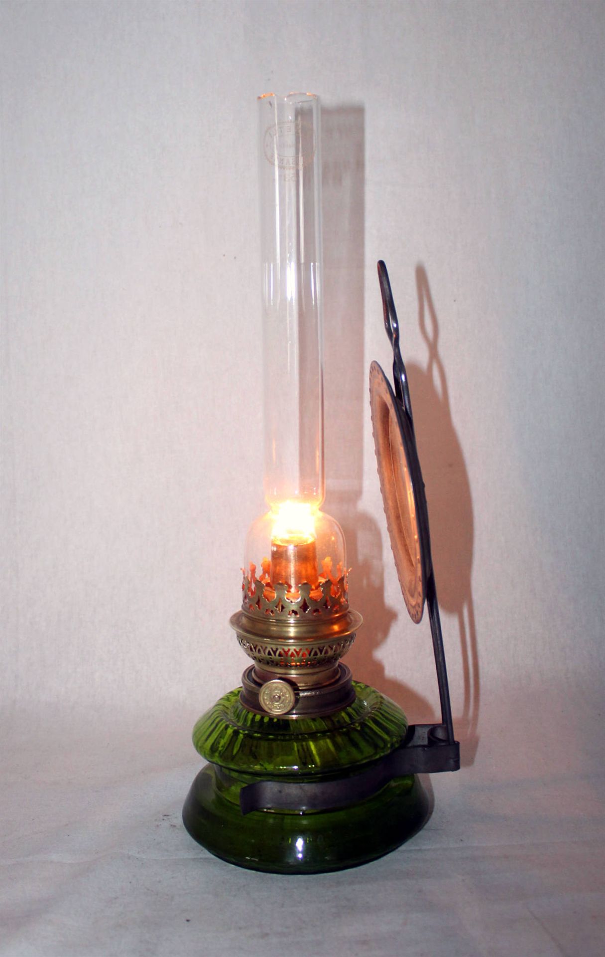 Antike Wand- bzw. Küchen-Petrollampe aus der Zeit um 1900, mit Weißblechreflektor in klassischer, funktionaler Ausführung verm. Deutschland
